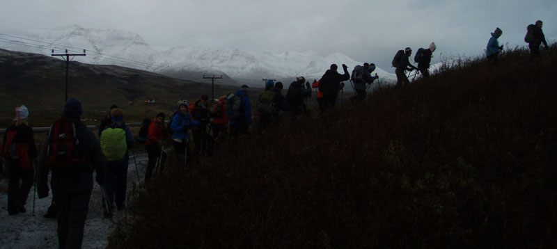 Gengið var upp skíðasvæðið í suðurhlíðum beinustu leið á hæsta tind þar sem veðrið bauð ekki upp á neinar gloríur og sóttist þetta ansi vel þar sem vindurinn kom í veg fyrir að menn stöldruðu mikið við og skoðuðu sig um í fallegu haustlitunum sem nutu sín vel þegar kvöldsólin leit við á köflum með fjallasýnina sunnan megin fjallsins.