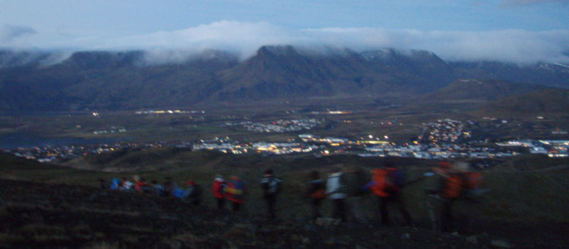 Ofan af Stórahnúk var gengið svo hratt að ljósop myndavélarinnar náði bara að búa til hrærigraut úr göngumönnunum en festi skýrari mynd af Esjunni með sængina útbreidda yfir sig fyrir nóttina og Mosfellsbæ fyrir náttlampa... Ljósflugur kvöldsins: Alexander, Alma M., Anna Sigga, Anton, Arnar, Auður, Ágústa, Árni, Áslaug, Ásta H., Bára, Björn, Brynja, Einar, Elsa, Guðjón Pétur, Guðrún G., Guðrún Helga, Gylfi Þór, Halldóra Á., Hanna, Heiðrún, Heimir, Helga Bj., Hermann, Inna, Ingi, Irma, Jón Júlíus, Kári Rúnar, Ketill, Kristín Gunda, Lilja K., Lilja Sesselja, Ragnhildur, Rikki, Roar, Rósa, Sif, Sigga Sig., Sirrý, Sigrún, Skúli, Súsanna, Svala, Sæmundur, Torfi, Valdís, Þorsteinn J., Þóra og Örn.