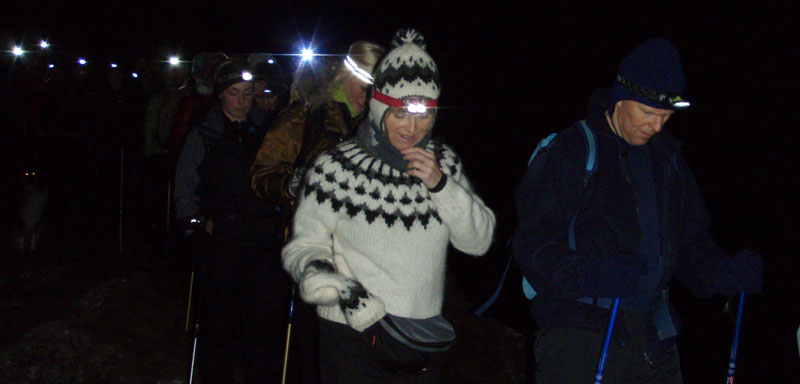 Alls mættu 51 manns á æfingu þriðjudaginn 26. október og gengu góðan útsýnishring á Úlfarsfelli í áhrifamiklum ljósagjörningi náttúrunnar með sólina í vestri og tunglið í austri... og glitrandi fjallasýnina allan hringinn fjær og gyllt borgarljósin nær.