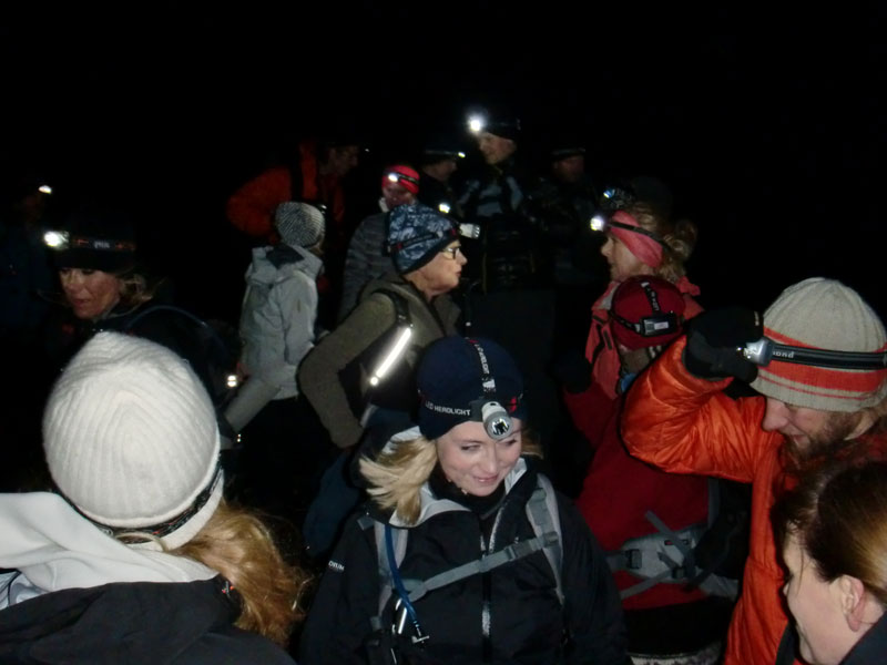 Nestistíminn í bröttum brúnum Geithóls í myrkrinu varð eitthvað endaslepptur þar sem menn höfðu mismikla þörf og þolinmæði til þess að staldra við... en öll fórum við saman niður eftir í myrkrinu beinustu leið gegnum grjót og gras framhjá skóginum með ljósadýrðina í fanginu... Það er ráð að stilla sig inn á takt hópsins og leyfi nestistímanum að fá sitt svigrúm eins og annað þar sem nauðsynlegt er að halda hópinn í myrkrinu og flóknara að taka rásina á eigin vegum til baka.. klæða sig einfaldlega eftir veðri fyrir bæði göngu og pásu... slaka á og njóta augnabliksins... þó ekki væri nema njóta tunglsins í myrkrinu... að skína á hvíta fjallatinda Kistufells... og stjörnudýrð Karlsvagnsins sem glitraði ofan við Þverfellshornið á heiðskírum himninum... Hörkuæfing og heldur meira krefjandi en þjálfara minnti... ... eða alls 6,5 km á 2:55 - 3:01 klst. upp í 268 m hæð á Kögunarhóli, 488 m á Rauðhól og 566 m á Geithól skv gps. Hekla