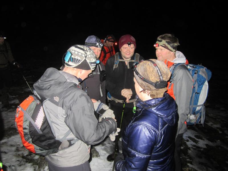 Ágætis skyggni til að byrja með um fjallslendurnar og við fylgdumst eftirvæntingarfull með þremenningunum sem komu seinna á æfinguna og virtust alltaf vera að því komin að ná okkur... bárum aldrei kennsl á þau í myrkrinu og fjarlægðinni... en þegar þokan lagðist yfir ofar á Langahrygg sáum við ekki meira til þeirra og vonuðu að annað hvort væru þau með gps punkta af leiðinni (allavega Steininum) eða þau myndu snúa við... sem þau og líklegast gerðu því við sáum ljósin á leið niður þegar við vorum að skila okkur niður á bílastæði við Mógilsá... og þjálfara ákváðu að hinkra eftir þeim á bílastæðinu til að kasta kveðju á hina dularfullu þremenninga... en misstu af þeim í myrkrinu...