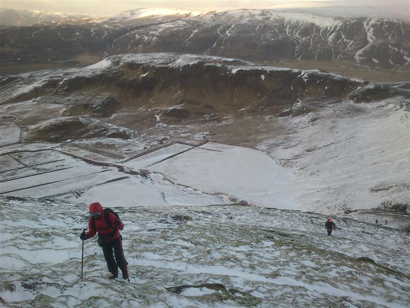 Þetta var ansi þétt og langt upp eftir... enda ein af þessum endalausum brekkum sem blekkja mann með "tindarlegum" klettabeltum efst séð að neðan.... en eru svo bara millibrúnir fyrir tindinn sem rís miklu ofar bak við hnúka og hjalla...