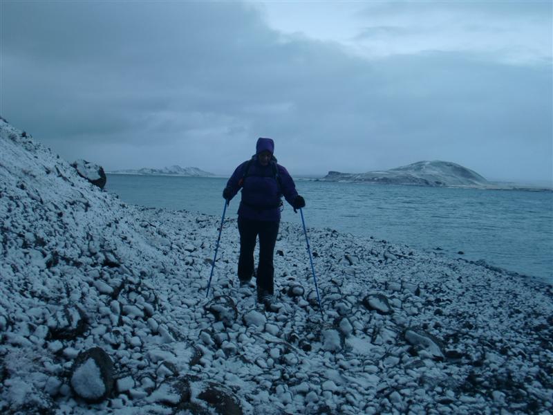 fjarska í suðri og gönguleið okkar meðfram ströndinni hægra