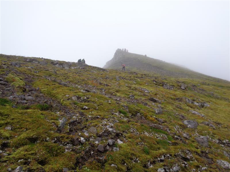 Þórnýjartindur er brattur en mosasleginn að mestu alla leið upp á topp...