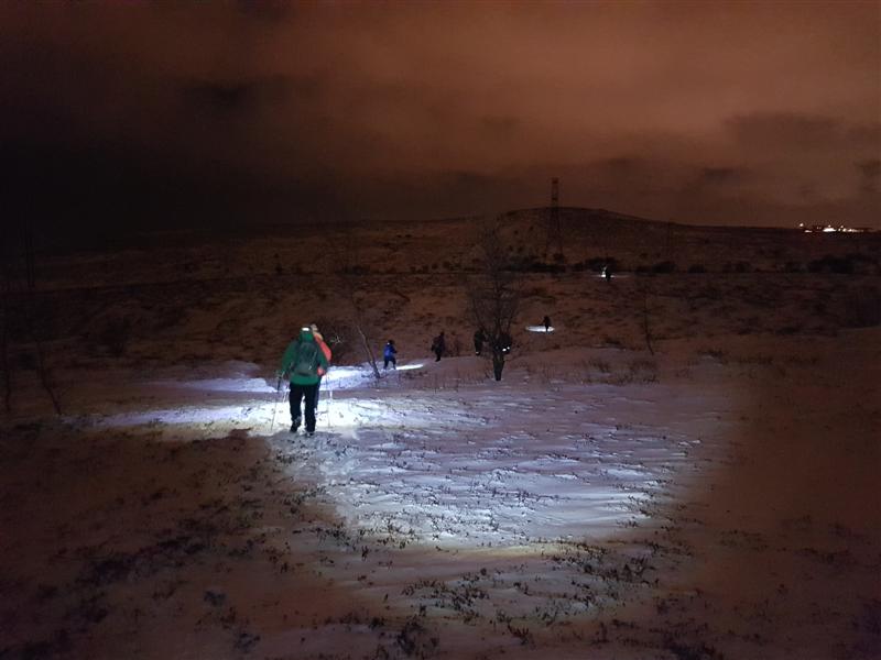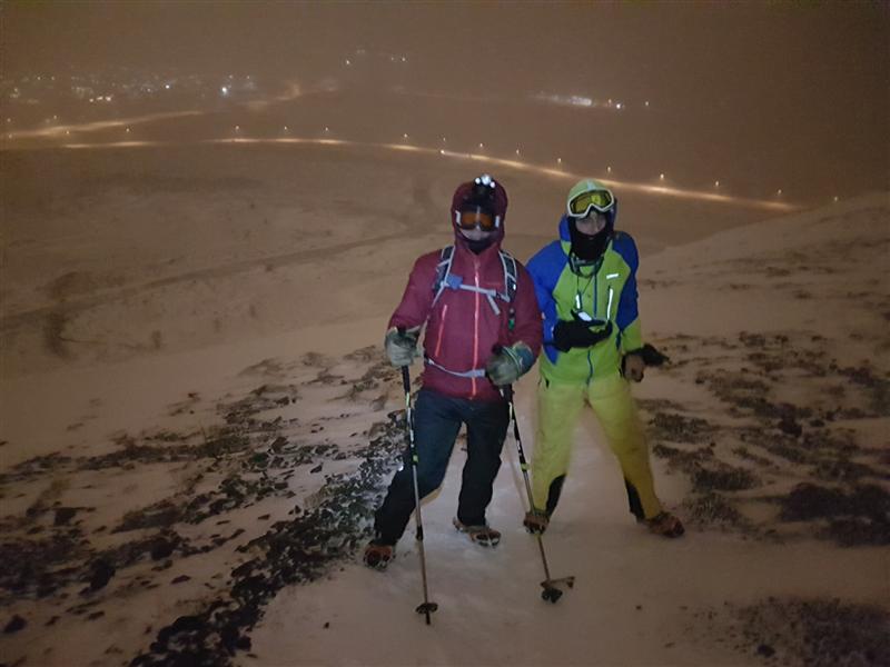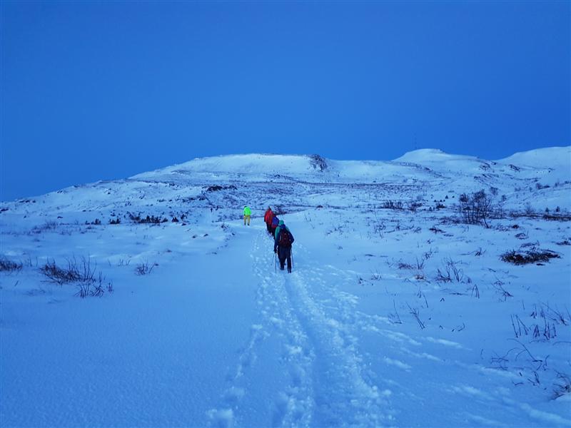 gönguna... spjölluðum saman... fórum yfir búnaðinn.. Lexíur kvöldsins voru margar... meðal annars þessar: 1. Það er erfitt að sjá á gps-tækin í hríðarbyl, sérstaklega þegar maður er hættur að sjá nema hafa lesgleraugu :-) 2. Maður er fljótur að afvegaleiðast af réttri leið þegar vindur og halli í landslagi togar í eina átt. 3. Það er nauðsynlegt að vera með gps-punkt á mikilvægum stöðum eins og efstu brún í brekkunni sem við vorum líklega bara með í gömlu gps-úrunum frá fyrstu árum Toppfara þegar við vorum alltaf á litlu fellunum við borgina og vorum komin með mjög dýrmætt safn af alls kyns gps-punktum sem glötuðust þegar gps-úrin úreltust því miður... 4. Æskilegast er þegar von er á slæmu veðri og lélegu skyggni að velja æfingafjall sem er lítið umleikis og með góð kennileiti allt í kring eins og borgarljós og upplýsta þjóðvegi sem vísa mjög vel veginn ofan af fjallinu til að átta sig á staðsetningu. 5. Þó eingöngu þrír