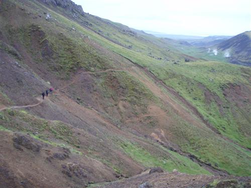 Við komum að bílunum eftir um 8,4 km (?) göngu á tæpum 4 klst. (?) og skelltum á okkur sundfötum og lögðum í hann inn Reykjadalinn þar sem heitur lækur rennur úr Klambragili... en þessi göngukafli reyndist vera 1,6 km langur og voru menn ans þakklátir þegar þeir loksins fengu notið heita náttúrubaðsins eftir langa göngu. Veðrið yndislegt, lygnt og hlýtt og kvöldsólin að gæla við léttskýjaðan himininn bak við Molddala- og Ölkelduhnúka.