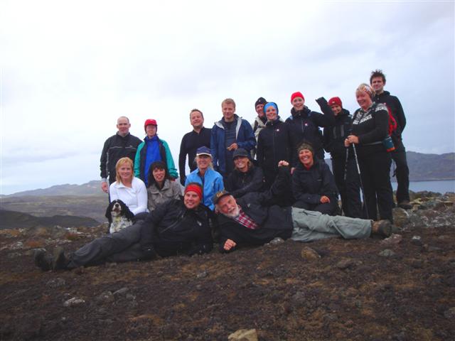 Þar fórum við á kostum og tókum klettahópmynd við "klettagatið" á miðri leið en myndavélinni tókst ekki betur til en svo að fókusinn vantaði aðeins í þessari ljósvillu... greyjið... mikil synd með allt þetta brosandi fólk í myndinni en brosin öll bæta þetta upp... Sigga, Heimir, Sigga Rósa, Íris Ósk, Anna Margrét, Lilja, Sirrý, Kristbjörg, Stefán Alfreðs, Helga Bj., Hildur Á., Birgir, Örn, Jón Finnur, Alexander, Sæmundur og Stefán Heimir en Bára tók mynd.