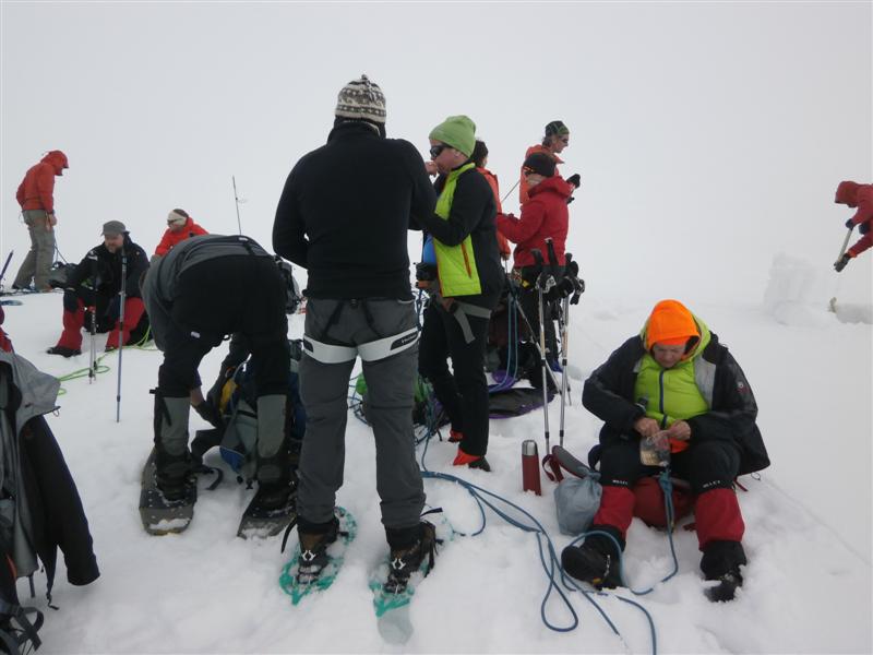 Eftir krefjandi sprungukafla þar sem leiðsögumenn sýndu staka útsjónarsemi og þrautseigju við að koma okkur yfir var áð í snjónum...