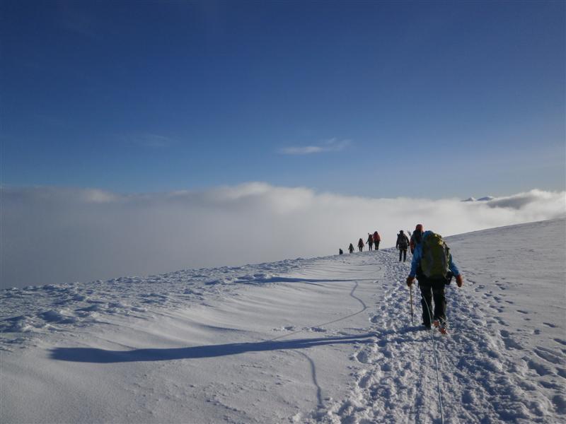Erfiðasta gangan í sögu Toppfara var farin á uppstigningardag 29. maí 2014 um öskjubarm Öræfajökuls á þrjá hæstu tinda landsins þar sem farið var upp kolsprungna Hnappaleið og niður Sandfellsleið í góðu veðri og færi en hrímþoku að mestu á öskjubarminum... þar sem sólin skein að hluta upp Hnappana og á öskjunni en lét svo ekkert sjá sig á Sveinstindi né Snæbreið... en gyllti allt ógleymanlegri sigurbirtu á hæsta tindi landsins þar sem gengið var upp úr skýjunum... Alls 31 km eða svo á 19 - 20 klst. upp í 2.052 m hæð á Sveinstindi, 2.036 m á Snæbreið og 2.117 m mældri hæð á Hnúknum.