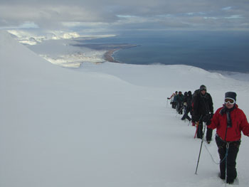 af stað í línum.Kosturinn við línur er sá að það er haldið hópinn en ókosturinn er frelsisskerðingin. Hvorki er hægt að fara hraðar eða hægar en línan, ekki hægt að stoppa né fara út fyrir og taka t. d. myndir... óþolandi fyrir þá sem eru eins og skopparakringlur í fjallgöngum og fyrir þá sem vilja stjórna sínum hraða... Aðrir kippa sér ekkert upp við þetta. Maður skilur vel þá sem vilja ekki þennan ferðamáta en að sama skapi er ævintýralegt að ganga á jökli og við munum ganga á þá árlega áfram í þessum klúbbi. |