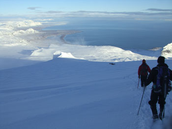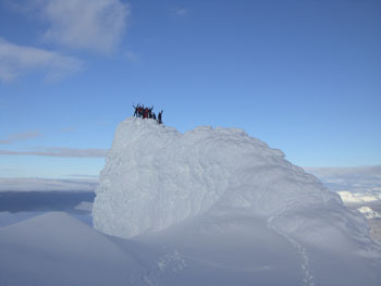 frá Írisi Ósk:Tekin ofan af tindinum niður á hópinn. Snjóhengjan var þarna til vesturs með snarbratta niður á nesið. Það er næstum eins og við séum að detta fram af... Jeminn, færið ykkur neðar... |