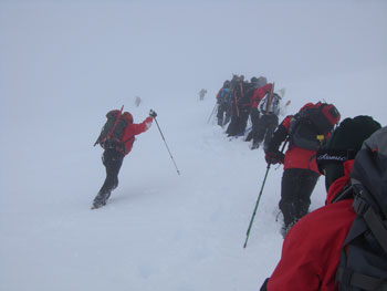 línan:Halldóra Á., Örn, Helga Sig., Roar, Herdís Dröfn, Þorleifur, Soffía Rósa, Sigríður E., Halldóra Þ. og Hilma. Við fetuðum okkur áfram og gáfumst ekki upp... þetta skyldi takast þrátt fyrir alla verki og þreytu... Bára lamdi menn áfram með blíðuhótum... Fyrri línan kom upp nokkrum mínútum fyrr og var alsæl á svipinn úr fjarlægð þegar við fetuðum síðustu metrana. |
