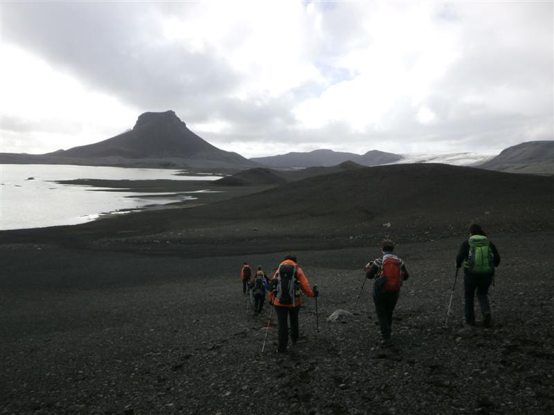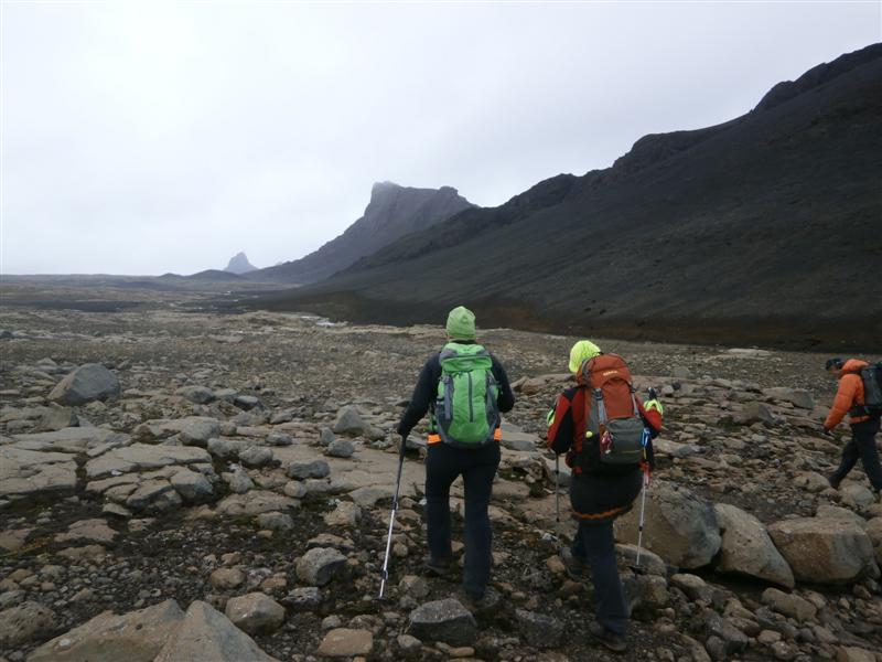 Viš gengum inn ķ Jarlhettudalinn sjįlfan sunnan Raušhettu...žar sem tindarnir risu hver af öšrum umluktir jökulvötnum og brįšnandi jöklinum ķ vestri...