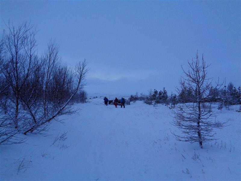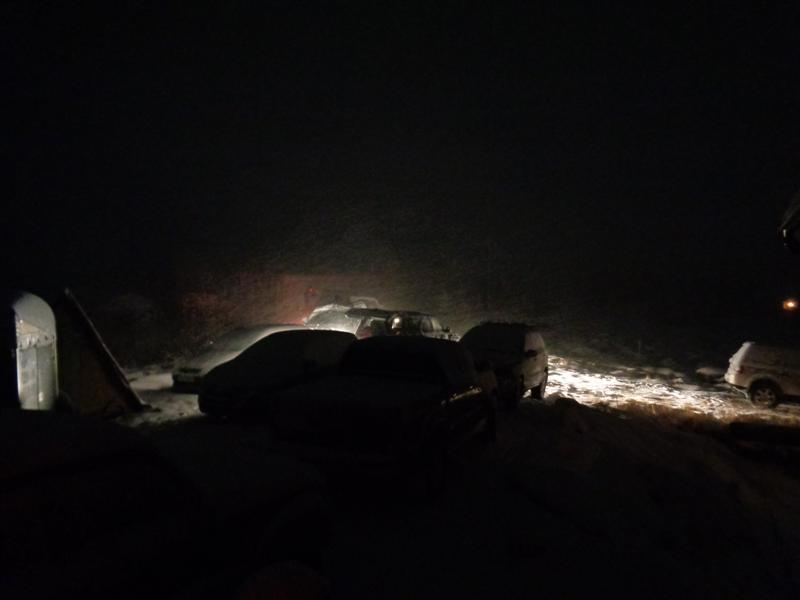 Nú gekk á með snjóhríð meðan fyrstu menn biðu eftir þeim síðustu...
