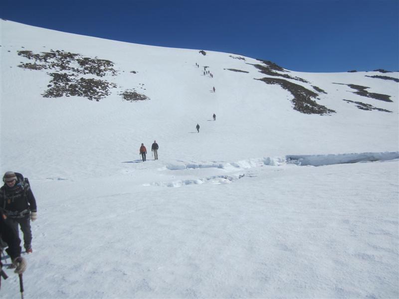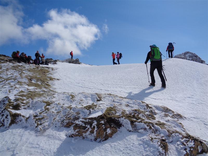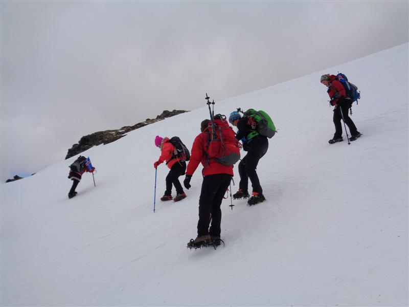 Svo hann skaust niður með öllum hópnum og sporaði snöggvast út góð spor í glerhörðum skaflinum til að komst yfir í betri brekku í átt að skarðinu.. Allir í hálkubrodda eða jöklabrodda, þjálfari mælti með hálkubroddum þar sem við vorum mestmegnis á grjóti og mjög erfitt að fóta sig á jöklabroddum í grjóti í þetta miklum halla... úr því væri verið að spora vel yfir skaflinn sem fara þurfti yfir á leið til baka... en skiptar skoðanir voru með það og þeir sem voru vanari fóru í jöklabroddana sína sem var vel enda komust þeir þá öruggir yfir skaflinn og þurftu ekki að elta hópinn. Það var hins vegar mat þjálfara að hálkubroddarnir hentuðu almennt betur þarna, sérstaklega fyrir þá óvanari því að fara skyndilega á jöklabrodda í miklum halla og miklu grjóti skapaði að hennar mati meiri slysahættu en að vera í hálkubroddunum og með göngustafina í báðum höndum eins og menn eru vanir því þegar farið er í jöklabrodda þá er betra að gera það í minni bratta við betri aðstæður og komast vel í gírinn á þeim í þægilegri halla. Með réttu var og bent á að hafa ætti ísexina í hönd þegar farið væri yfir skaflinn þar sem hann var löng og brött brekka niður, en það var líka mat þjálfara að í þessum halla væri ráðlegast að allir héldu sama striki og kæmu sér yfir skaflinn með stuðningi stafanna sem þeir eru vanir og svo gæfum við okkur góðan tíma til að fara í jöklabrodda og með ísexi í hönd eftir það... en þetta er alltaf matsatriðið hverju sinni og ágætis dæmi af okkar hálfu um hvers vegna sveigt er framhjá reglunni með að í miklum bratta og hálku skal ganga í jöklabroddum og með ísexi í hönd til að geta stöðvað sig ef maður rennur af stað svo sitt sýnist alltaf hverjum og einum í þessu.