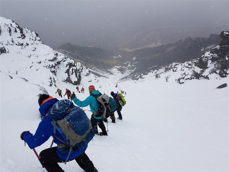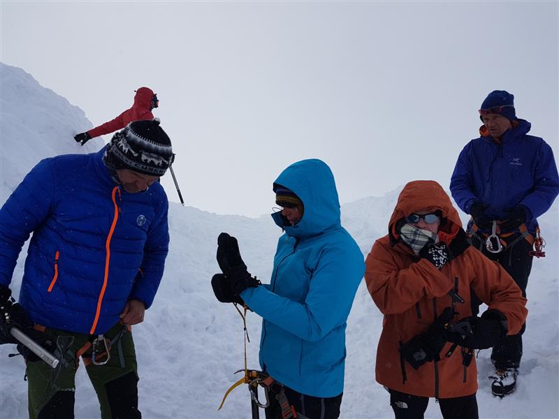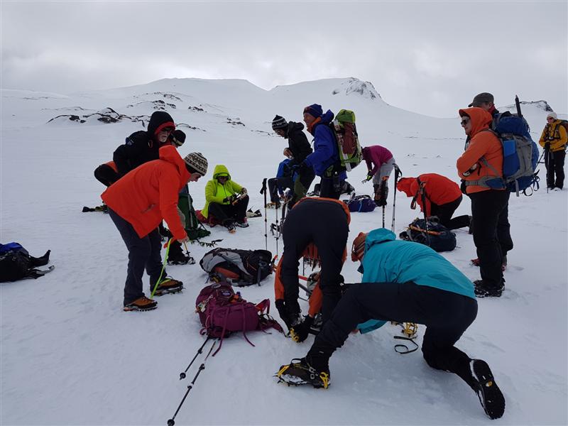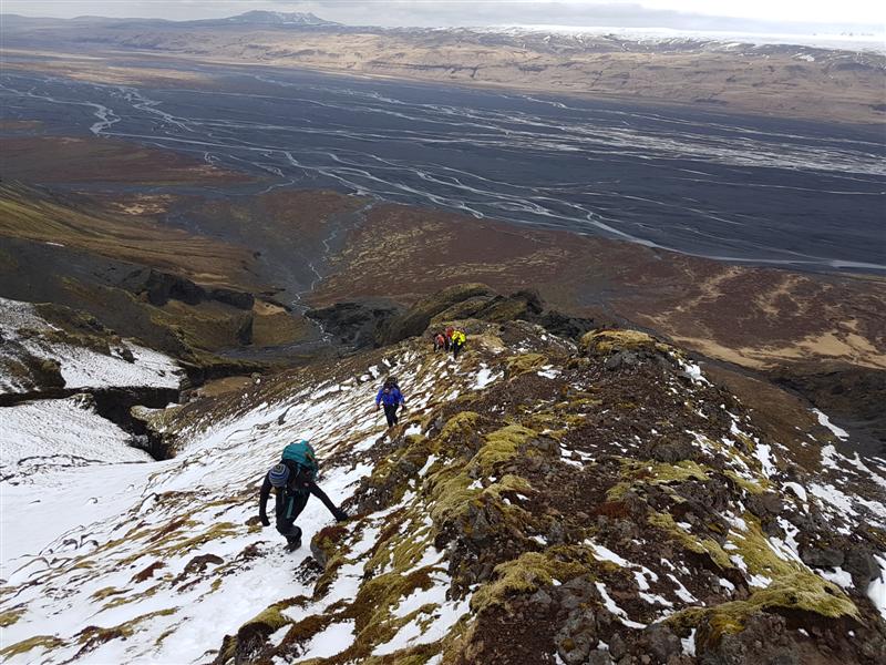 Nú reyndi á öryggistilfinningu og reynslu af því að fara niður bratta langa brekku í ísbroddum...
