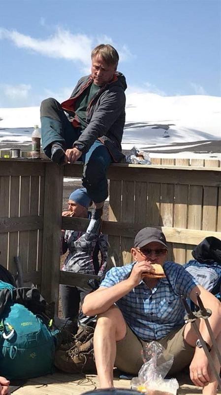 Þá var ekkert annað í boði en setjast á tröppurnar eða fyrir framan skálann í sólinni...