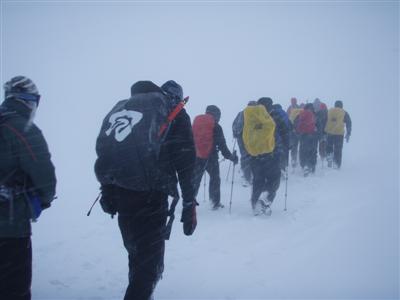 Flestir voru orðnir blautir í fætur þegar á leið og kuldinn beit á stundum þar sem vindurinn var mikill en þó var margt með okkur sem olli því að við náðum alla leið í 1.324 m hæð eftir fjögurra eða fimm og hálfrar klukkustundar uppgöngu (eftir því hvenær menn lögðu af stað gangandi). Við höfum lent í meiri kulda, hvassari vindi og erfiðara færi en þarna svo reynslan fleytti okkur einnig áleiðis því ekkert var gefið eftir. Meðvindurinn feykti okkur svo til baka... myrkrið skall smám saman á þegar nokkrir kílómetrar voru eftir að bílunum og var klöngrast niður grýtta hlíðina niður á "láglendið" með höfuðljós á enninu eins og ekkert væri eðlilegra svona mitt í óbyggðum í Kaldadal.. það var hrein unun að sjá æðruleysið sem þá ríkti... Virkilega blaut og fljótt köld en stolt og sæl með dagsverkið skiluðum við okkur í bílana í myrkrinu smám saman á meðan Ingi og Jóngeir ferjuðu óðum hópinn suður að hinum bílunum og gengu menn mislangt sökum þessa þennan dag, þeir lengstu 24 km (Jón Gauti og Örn) en sjálf fjallgangan frá "efstu bílum" var um 17 km löng á 6:55 klst? Kannski ekki svaðilför... við höfum stundum séð það svartara... en afskaplega langur dagur í krefjandi veðri með blauta fætur flestir og sumir að fara sinn fyrsta tind með hópnum... þrekvirki svo sannarlega sem skilaði okkur fjórða jöklinum í öðruvísi upplifun en nokkurn tíma áður á göngu í óbyggðum...