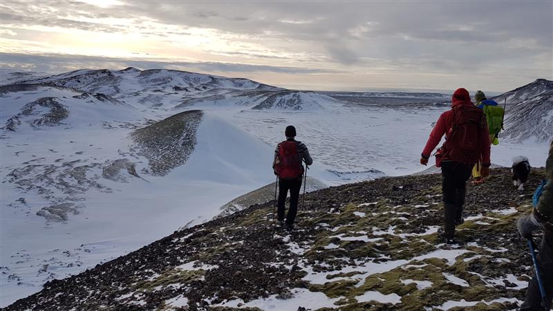 Komin upp á gígbarminn og farið eftir honum upp á hæsta tind... Stóra sandfell hér í baksýn hægra megin...