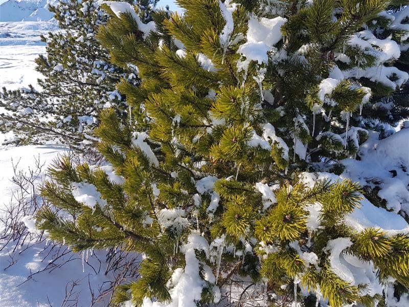 Lágur lofthiti en logn og sól... svo snjórinn breyttist í þetta klakahröngl á trjánum...
