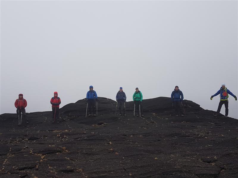 Við lögðum níu manns af stað kl. 8:29 frá nýja bílastæðinu við Búrfellsgjá... í grenjandi rigningu og roki... ... og á endanum fór svo að vindurinn var minni en við áttum von á... ... en það eina sem var ekki gott var rigningin... hún kom og fór á löngum köflum... Þjálfari stappaði í menn stálinu og þarna á bílastæðinu vorum við byrjuð að hlæja að sjálfum okkur að detta þetta í hug...