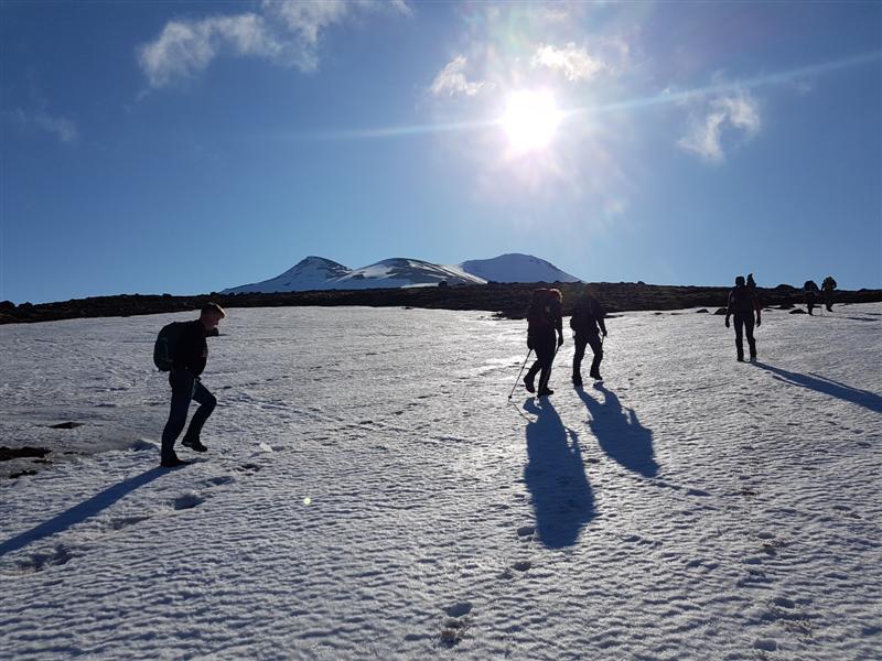 Hér erum við að ganga yfir snjóbrú á Súluá...