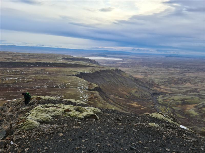 ...hinir leiðangursmenn dagsins... sýnin til suðurs eftir öllum fimm Kálfstindum Þingvalla ofan af hæsta tindi þeirra sem er nyrstur í um 900 m hæð... tindurinn Kleifur (okkar nafngift) sem var einnig genginn, Flosatindur þar aftar með klettótta nefið sitt (oftast genginn og þekktastur allra fimm Kálfstindanna) en hann var genginn í bakaleiðinni af helmingi hópsins... og svo illkleifir syðstu tveir í hvarfi... ... mjög krefjandi landslag á tvo eða þrjá bratta tinda og eitt Þverfell til viðbótar til upphitunar í byrjun... í miklum bratta á alla þrjá... einstaklega lausgrýttu landslagi sem reif verulega í og var erfitt yfirferðar með sviptivindana stöðugt lemjandi á okkur allan daginn... algert afrek að gera þetta...við tökum ofan fyrir leiðangursmönnum dagsins :-) Alls um 13 +/- km á 7,5 - 8 klst. upp í tæplega 898 m hæð með alls hækkun um 1.600m hæð... tölfræðin segir allt um erfiðleikastigið ! Ferðasagan í heild hér:
