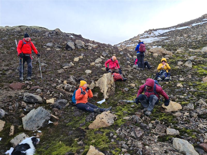 Smá áning hér við rætur Kleifs eftir krefjandi fjallgöngu niður í mót... 2ja metra reglan alveg að gera sig...