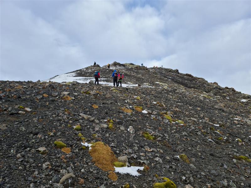 Léttirinn var mikill að sjá þau koma niður... þetta fór sem betur fer vel... en að þeirra sögn var þetta krefjandi tindur... bröltið var heilmikið... vindurinn var svakalegur efst og þau þurftu að halda hvort í annað á kafla þar sem þetta var svo sviptivindasamt... sex komust alla leið á tindinn en Bjarna og Sillu leist ekki á ástandið efst og sneru þar við... sem hinir lýstu sem svo að "þau hefðu tekið þá skynsamlegu ákvörðun um að snúa við"... Örn þjálfari sagði eftir á að hyggja að þetta hefði verið það krefjandi aðstæður að í raun hefðu þau átt að sleppa þessum tindi... ... því þegar upp á tindinn var komið var bálhvasst og miklir sviptivindar... menn reyndu að finna sér skjól gegn þeim og fremstu menn settust niður meðan hinir skiluðu sér alla leið upp... menn náðu samt að taka myndir og myndbönd af tindinum sem var vel af sér vikið (Agnar og Sigurður)... þegar allir voru komnir á tindinn var snúið strax til baka... efsta kaflann frá tindavörðunni gengu menn tveir og tveir saman þar sem einhverjir voru nærri foknir en tindurinn á Flosa er brattur á alla kanta þó það sé heilmikið pláss uppi... svo gekk mjög vel að fara niður og hópurinn var fljótur að koma sér í skaplegri vind neðar en vindurinn hélt samt áfram að sópa öllum ofan af fjallinu til suðurs... enda versnandi vindur er leið fram að kveldi...