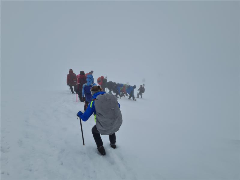 Þessi þrengsli þýddu að allir kúldruðust við að festa á sig broddana og ná í ísexina og pakka niður stöfunum... og þrengslin voru slík að Örn lagði fljótlega af stað upp eftir hryggnum til að gefa hinum meira pláss og þeim sem voru tilbúnir að leggja af stað á eftir honum að kanna aðstæður... en lexía 6 hér er sú að þjálfarar fara alltaf yfir notkun jöklabrodda og ísexi þegar við förum í þennan búnað en þarna leyfðu þrengslin það ekki og því varð ekkert úr því... og þó menn hafi átt að "lesa heima" og flestir "vanir" þessum búnaði þá voru sumir að fara í jöklabrodda í einum af sínum fyrstum skiptum í lífinu og jafnvel langt síðan síðast,þar sem þetta var önnur ferðin í vetur þar sem þörf hefur verið á jöklabroddum svo það hefðu allir þurft smá upprifjun og yfirferð á hvernig skal bera sig að við göngu á jöklabroddum með ísexi í hönd...