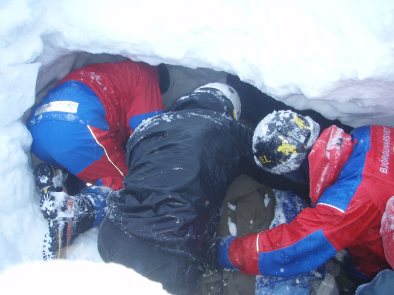 nokkra kílómetra niður að bílunum eftir allt saman. 4. Stjórn Jóns Gauta á aðstæðum var til fyrirmyndar allan tímann og við skipuðum okkur öll undir hann án þess að véfengja hans stjórnun. Verkaskiptingin á slysstað, láta menn borða sér til hita, moka sér til hita og halda Siggu svo heitri eftir moksturinn hélt okkur án efa gangandi allan þennan tíma. Hann kallaði strax á hjálp og gerði vel grein fyrir alvarleika málsins frá byrjun, hann sýndi allan tímann af sér öryggi og festu og sýndi aldrei af sér ráðaleysi eða uppgjöf sem var mikilvægt til að við gætum unnið saman sem einn maður án þess að bugast. 5. Samstaðan innan hópsins var fölskvalaus allt til enda. Við unnum sem einn maður allan tímann, hlýddum Jóni Gauta og gerðum það sem lagt var til, vorum aldrei ósammála né deildum um einstaka atriði heldur sýndum samvinnu og samstöðu allan tímann. Enginn dró sig í hlé, varð sjálflægur, vildi fara niður eða var ósammála því sem verið var að gera, sem hefði vel getað orðið og er algengt í svipuðum slysum.