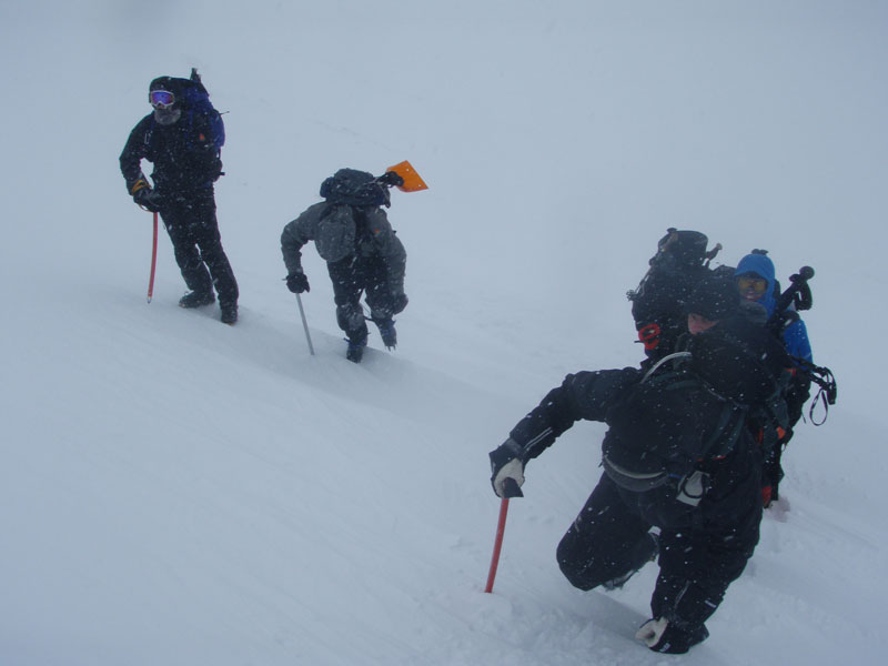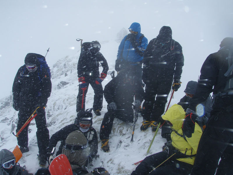 Þegar komið var upp í tæplega 900 m hæð var veðrið farið að versna og farið að renna á okkur tvær grímur með að komast á tindinn við þessar aðstæður svo Jón Gauti bað okkur um að bíða og fór á undan til að kanna aðstæður. Á meðan fór Örn upp á hrygginn beint fyrir ofan okkur til að kanna gönguaðstæður þar og nokkrir fóru áleiðis á eftir honum en hann benti mönnum á að fara ekki lengra þar sem brattinn var mikill og hálkan eftir því, svo menn lögðust niður og biðu hver á sínum stað. Þarna varð maður óþreyjufullur eftir Jóni Gauta og hafði áhyggjur af honum einum þarna uppi í hríðinni. Að manni hvarflaði sú hugsun hvað við myndum gera ef hann skilaði sér ekki aftur til baka. Hversu langan tíma áttum við að gefa honum til að meta aðstæður? Loks birtist hann, slakur og yfirvegaður eins og alltaf, það var kærkomin sjón og kallaði okkur á fund við klettahjalla einn þar sem við komum okkur saman í hnapp til skrafs og ráðagerða. Þar tilkynnti hann okkur að tindurinn yrði ekki sigraður að sinni, veðrið væri verra þarna uppi og brattinn slíkur að ekki væri ráð að fara þarna um í slíkri hálku og hvössum vindhviðum... þessu vorum við sammála og hálfpartinn fegin. Við ákváðum að láta nægja að fara upp á hrygginn sem var fyrir ofan okkur þar sem við vorum þó komin þetta langt upp við krefjandi aðstæður enda veðrið ekki orðið slæmt ennþá og allir í góðu standi.