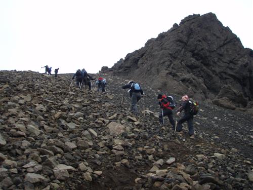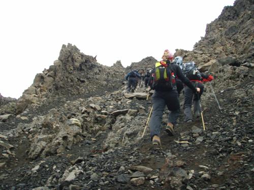 Við tóku brekkurnar upp úr dalnum en þær voru heldur hálar í leysingunum síðustu daga með klakann undir þunnu snjólagi og glerhált var við kletta og grjót svo ógerningur var á köflum að fara ofar. Örn fór á undan og fann betri leið eftir að hafa reynt að höggva spor í harðan snjóinn á kaflanum sem upphaflega var ætlunin að ganga um en mönnum hafði ekki litist á. Enginn með ísexi þar sem við vorum sannfærð um að í þessum lofthita síðustu daga væri bara dúnmjúkur snjór þarna uppi eins og rúmri viku fyrr þegar þjálfarar tóku könnunarleiðangur á fjallið. Þetta kenndi manni í eitt skipti fyrir öll að ísexi er með í för á fjöll yfir 900 - 1.000 m þó það sé hásumar og hitabeltisveður á landinu og menn gapandi af hneykslun í kringum mann yfir búnaðinum ! Þessi kafli tafði okkur talsvert en var ágætis verkefni á gönguleið sem annars er allt of stutt og auðveld á jafn reisulegt fjall og Hlöðufellið er svona hvað varðar ímynd þess og glæsileik...:-)