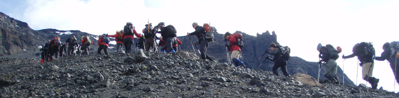 Þarna var hópurinn allur kominn í eina línu upp og hægt var að þvera til vinstri í átt að vörðunni á brúninni...