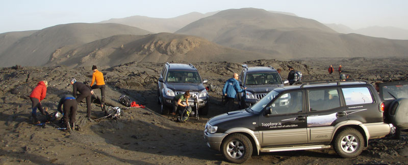 Malarstæðið við uppgönguleiðina með Kollóttadyngju (1.188 m) í baksýn. Ein úr hópnum tók þá ákvörðun að ganga ekki upp á Herðubreið að sinni og gekk hún einsömul til baka að bílunum og fór gegnum hraunið á bílnum hans Gylfa Þórs. Þá hafði ein úr hópnum ekki ætlað sér þarna upp þó hún kæmi með í ferðina svo á endanum vorum við 29 Toppfarar sem lögðum í hann þennan dag. Hópurinn hafði lesið sér til um göngu á Herðubreið úr ýmsum áttum, m. a. frásögn Bjarna E. Guðleifssonar úr nýútkominni bók hans "Á fjallatindum - Gönguferðir á hæstu fjöll í sýslum landsins" en sú lýsing þótti nokkuð fráhrindandi og óheppileg fyrir væntanlega Herðubreiðarfara... en í ljós kom þegar á reyndi að lýsingin var raunsönn miðað við okkar reynslu af fjallinu og átti því fullt erindi við þá sem undirbúa sig fyrir göngu á Herðubreið (þó við hefðum verið mörg sem syrgðum þessa kvíðavekjandi frásögn fyrir hönd margra í hópnum daginn fyrir gönguna). Þá höfðu þjálfarar verið í sambandi við "leiðsögumann Herðubreiðar", Ingvar Teitsson, en hann er leiðsögumann Ferðafélags Akureyrar og Íslands og leiðsegir á Herðubreið ár hvert í ágúst og hefur gengið á fjallið með hópa árum saman. Hann gaf þjálfurum upplýsingar um gönguleiðina sem slíka, gps-punkta og tölur sem nýttust vel í þessari ferð, kærar þakkir !