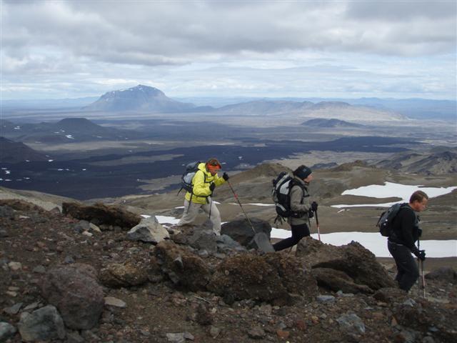 Og hópurinn gekk áfjáður um stórgrýtið með fjöllin allt um kring í fjarska.