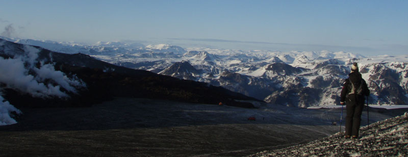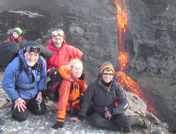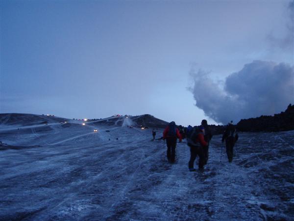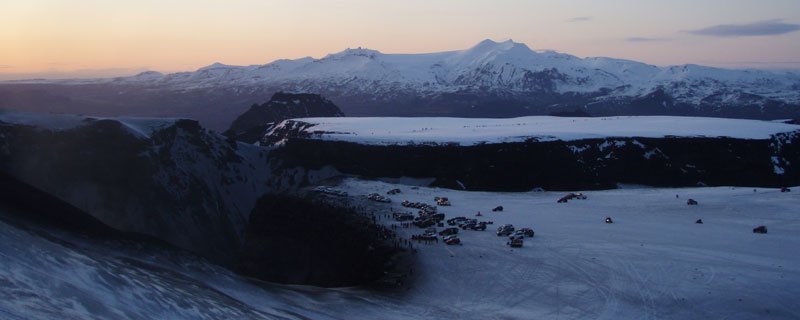Hinir voru jafn fegnir en þeir höfðu staðið í svipuðu stríði við leit að okkur hinum... Þeir sem farið höfðu á undan frá gilinu höfðu annað hvort sameinast hópi Arnar á hólnum eða hópi Báru við hraunbreiðuna og voru það sem betur fer allir. Örn hafði skipað mönnum harðlega að halda hópinn á stóra útsýnishól eldri gígsins þegar ljóst var að eftirlegukindurrnar úr Hrunagili skiluðu sér ekki upp á hann fyrr um kvöldið og tók sömu ákvörðun og hinn þjálfarinn, að halda að nýja gígnum. Við fyrstu sýn virtust allir vera á staðnum og það var nauðsynlegt að njóta augnablika nýja gígsins... þjálfarar mæltu með því að fara upp hólinn þeir sem hefðu þrek til þess en nándin við nýja gíginn var ekki síðri við línuna niðri. Menn drukku og nærðust, léttu á sér og löguðu sig til... það virtist ekki vera til beygur í mönnum með það sem framundan var en líklega földu menn það vel þeir sem burðuðust með hann.. 15 km ganga í myrkri og frosti eftir langan göngudag þá þegar... beygurinn var allavega til staðar í þjálfurum sem báru ábyrgðina og lásu upp menn í hópnum eftir bílum til að hægt væri að tryggja að allir væru á staðnum.. mikið var það góð niðurstaða... ferðin hefði flækst óumræðilega ef það vantaði einhvern...nei, þetta var samstilltur hópur sem vissi greinilega vel hvað hann var að gera og hafði þó haldið hópinn með öðrum hvorum þjálfaranum. Þegar við vorum að tygja okkur til heimfarar kom í ljós að Helga Björns hafði útvegað sér bílfar niður eftir vegna meiðsla og fór á endanum Gerður og Írunn með henni, þar sem meiðsli hrjáðu þær allar. Þær fengu hreinasta jeppaævintýri út úr þeirri för þar sem fararstjórar bílsins stóðu í björgunaraðgerðum fyrir aðra bíla alla leiðina niður um Mýrdalsjökulinn.
