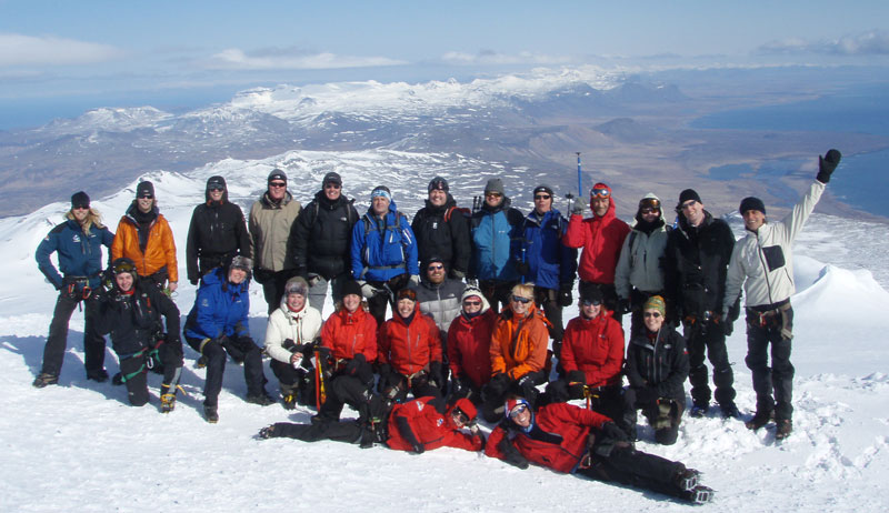 frá staðnum þar sem við hófum gönguna Fararstjórar jökulsins voru Jöklamenn eða Glacier Guides - www.glacierguides.is - sem ætla með Toppfara á Hnúkinn í maí. Gamlir og góðir félagar Toppfara voru einnig á göngu á jöklinum þennan dag, Íslenskir fjallaleiðsögumenn undir foryztu Jóns Gauta með fjallgönguklúbbinn sinn, Fjallafólk og það hljóp létt kapp í menn um hver yrði fyrstur á toppinn... en enginn hefur meira keppnisskap en Jón Gauti og skákaði hann okkur laglega í þessari rimmu sem var ekkert leiðinlegt, þetta var snilldargöngudagur...