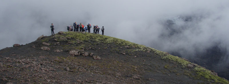 Á Búra jókst rigningin og þessi litfagri gígur þverneitaði að gefa nokkurt útsýni sem hefði verið kærkomið á miðri vegu gönguleiðar dagsins svo við fundum okkur það til dundurs að taka eina "blauta hópmynd"...