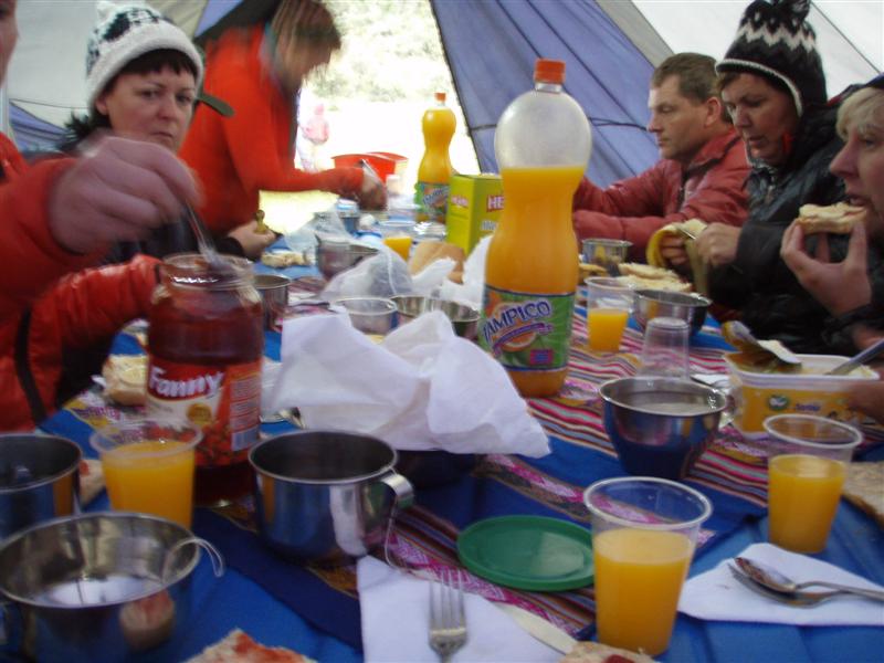 perúska drykkinn sem þau bjuggu til úr ávexti héraðsins... Og samlokan smurð þarna líka fyrir okkur á þessu litla borði...