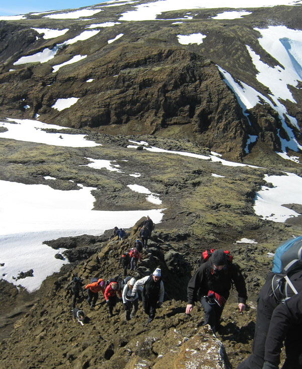 Niður var klöngrast í leit að skjólbetri stað fyrir allan hópinn...