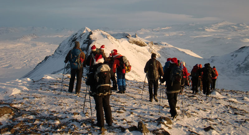 Toppfarar í jólaskapi í fjöllum... hópur sem "er út að leika" þegar hann fer á fjöll...
