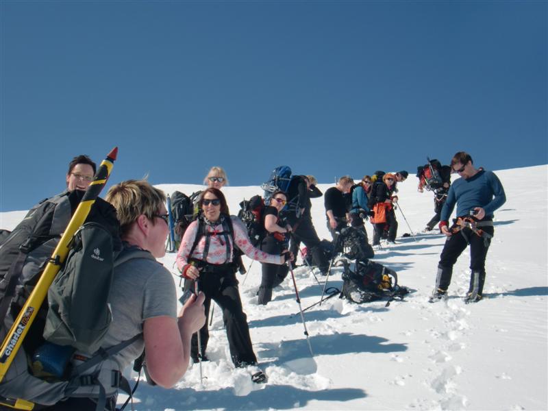 Ætlunin var að hafa einn Jöklamann frá Glacier Guides/Arctic Adventures til að tryggja öryggi við línuvinnu á jöklinum... en þar sem við færðum ferðina fram um tvo daga var engin leið að fá mann þann dag vegna yfirstandandi námskeiðs hjá Glacier Guides þessa vikuna... en þetta kom ekki að sök heldur varð til þess sem löngu var tímabært... að eftir ansi margar jöklaferðir og nýafstaðið vetrarfjallamennskunámskeið þar sem farið var í línuvinnu og einfalda sprungubjörgun á jökli ef línur eru fleiri en ein.... væri kominn tími til að þjálfarar og hópurinn tækist sjálfur á við línuvinnu á "öruggum" jökli eins og Snæfellsjökli að vorlagi þar sem línuvinna er fyrst og fremst til öryggis því sprungur eru vart sjáanlegar á jöklinum fyrr en í júní eða síðar um sumarið... þó aldrei sé hægt að vera fullviss með þetta enda mikilvægt að bera virðingu fyrir jöklunum og temja sér sömu öryggisráðstafanirnar öllum stundum.