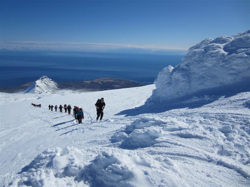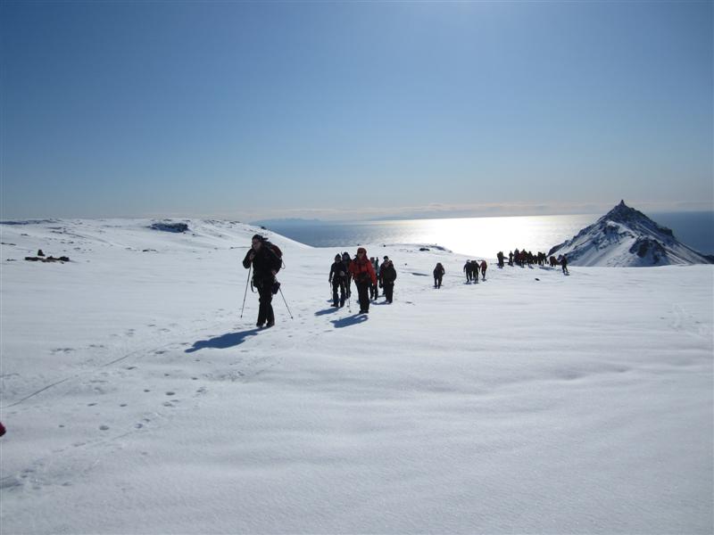 Á sumardaginn fyrsta... fimmtudaginn 19. apríl gengu hvorki meira né minna en 36 Toppfarar í þriðja sinn á Snæfellsjökul í mergjuðu veðri.... því albesta til þessa á þessum jökli... logni, sól og hita þar sem skýjaslæður skreyttu himininn á köflum... eða réttara sagt láglendið fyrir neðan okkur... Hópurinn var að fara í fyrsta sinn á jökul í línum á eigin vegum... en það var kominn tími til þess þegar um öruggari jöklaslóðir er að ræða eins og Snæfellsjökul... en til þess að það væri gerlegt með þetta stóran hóp nutu þjálfarar aðstoðar Jóhannesar björgunarsveitarmanns og Jóns Atla fjallamanns frá Vestfjörðum við línustjórnun og kunnum við þeim miklar þakkir fyrir hjálpina... það er ekki síst fyrir tilstilli öðlingsmanna eins og þeirra... og allra hinna sem lögðu sitt af mörkum þegar á bjátaði í einni línunni upp síðasta kaflann á tindinn... að Toppfarar sem samheldinn, hjálpsamur og áræðinn hópur er að upplifa þau ævintýri sem að baki eru gegnum þykkt og þunnt síðustu ár...