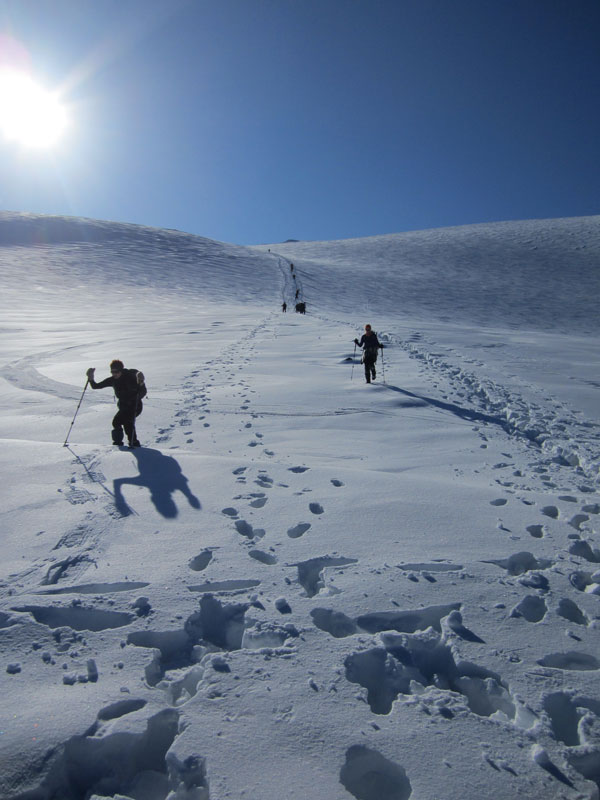 Sjá snjóbrautina sem myndaðist eftir hópinn og hve djúpt þetta var orðið á köflum...