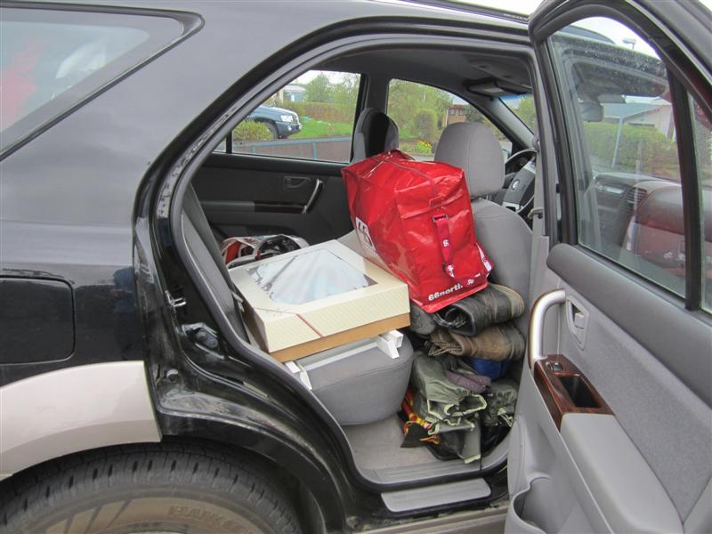 Kakan var fjórði farþeginn í bílnum... vel pökkuð innan um farangurinn og hjálmarnir hengdir á höfuðpúðann ofan við hana... Það segir ýmislegt um veðrið þessa helgi að til landsins kom hitabylgja sem ógnaði endingartíma kökunnar í heitum bílnum á leiðinni...