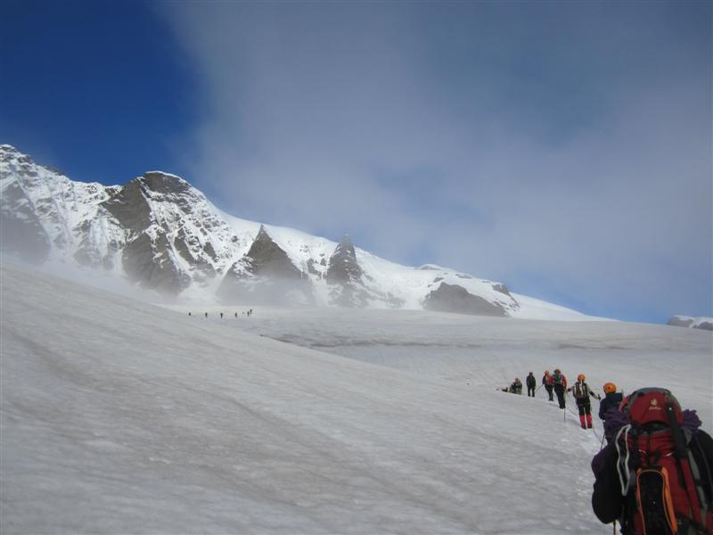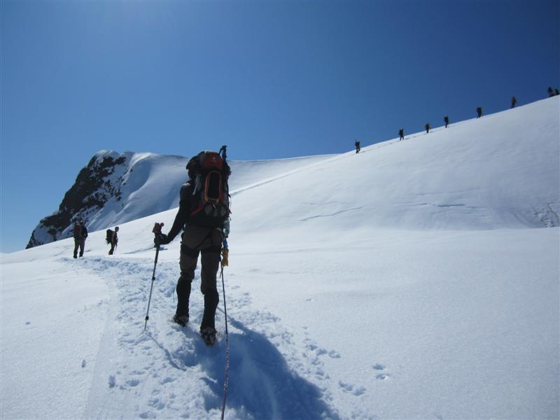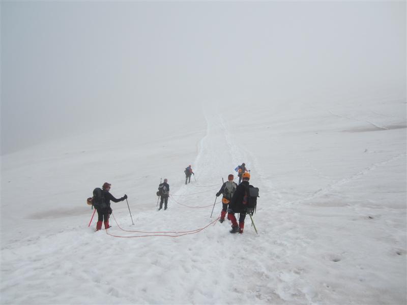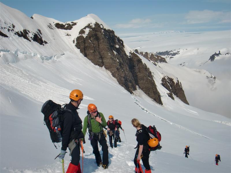 Við þveruðum skriðjökulinn Skrekk með því að fara samsíða sprungulaginu, gengum þversum á línunum yfir... annar hver maður hægra megin og annan hver maður vinstra megin... þannig dytti annar hver maður ofan í sprungu ef hún opnaðist og hinir myndu þá halda...