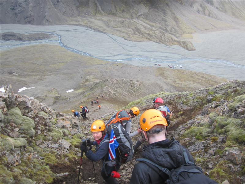 Litið til baka þar sem menn fóru tæpistiguna með aðstoð leiðsögumanna...