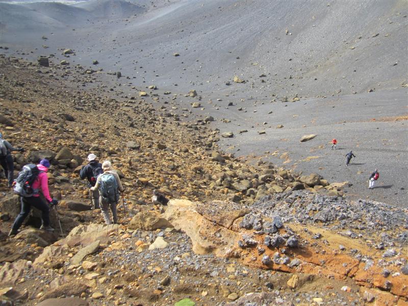 Örn fann fína leið niður af veitingastaðnum gegnum hamra og lausagrjót... Rauða Jarlhetta framundan.