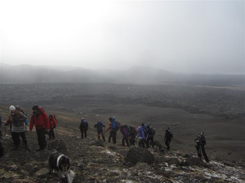 Laugardaginn 6. apríl gengu 33 Toppfarar baksviðs um fjallsrætur Heklu vestan megin og þræddu sig á kindagötum um síbreytilega leið um töfrandi fallegt landslag upp sex fjöll og fell meðfram hraunbreiðum sem skriðið höfðu um allt meðfram þeim frá eldfjallinu... Vetur réð enn ríkjum þrátt fyrir sumarkastið í vikunni sem leið og vor-rostinn í okkur var snarlega þaggaður niður... enda þrjár vikur í sumardaginn fyrsta... en við nutum kyrrðar óbyggðanna sem bauð upp á friðsælustu snjókomu í sögunni þar sem bókstaflega þurr snjókornin svifu letilega niður í skjóli eða fuku framhjá í golunni uppi á tindunum og gaf enn eina sérstöku upplifunina á fjöllum...